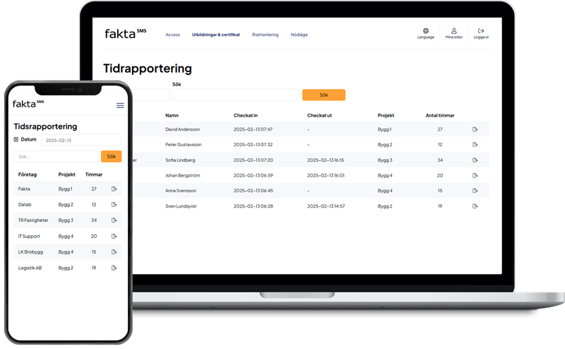 Med snabb in- och utcheckning via mobilen får du full kontroll över anställda, konsulter och entreprenörer. Genom säker identifiering med BankID eller Freja eID säkerställer du att rätt person är på plats – smidigt, säkert och pålitligt.